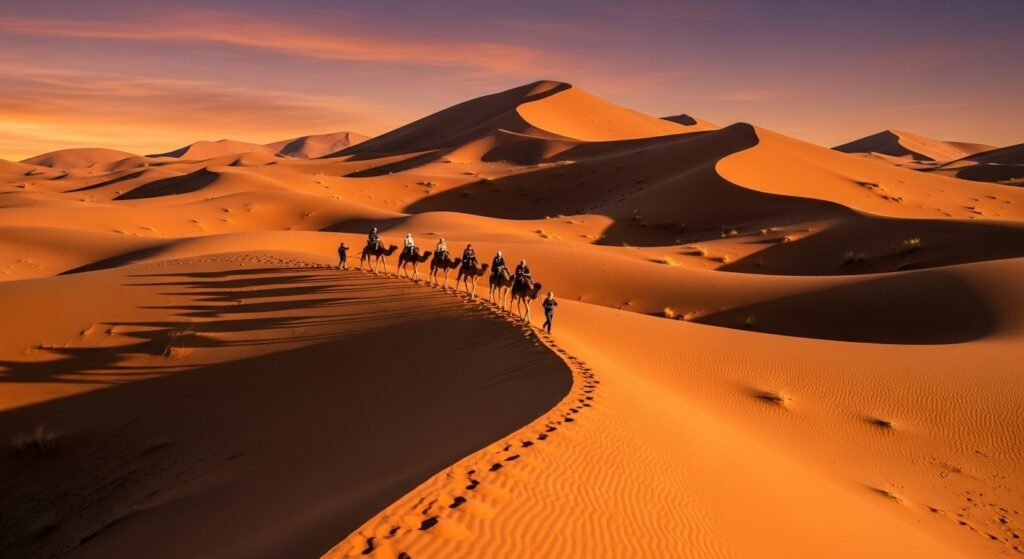 The journey from Marrakech to the Sahara Desert is a transition from complexity to sublime simplicity. Winding through the High Atlas Mountains, the landscape shifts from green valleys to stark, rocky plains, finally giving way to an ocean of sand: the Erg Chebbi dunes. The camel trek into the desert at sunset was a meditative experience. The only sound was the soft plod of the camels’ feet on the sand and the whisper of the wind. The dunes, rising hundreds of feet, were waves of liquid gold, their colors shifting with the dying light. That night, at a Berber camp, we ate under a celestial blanket of stars so bright and numerous they felt within arm’s reach. The silence of the desert is absolute, a profound emptiness that fills your soul. Waking before dawn to climb a dune and watch the sunrise—a slow, silent explosion of color over the endless horizon—was a moment of pure, unadulterated awe.